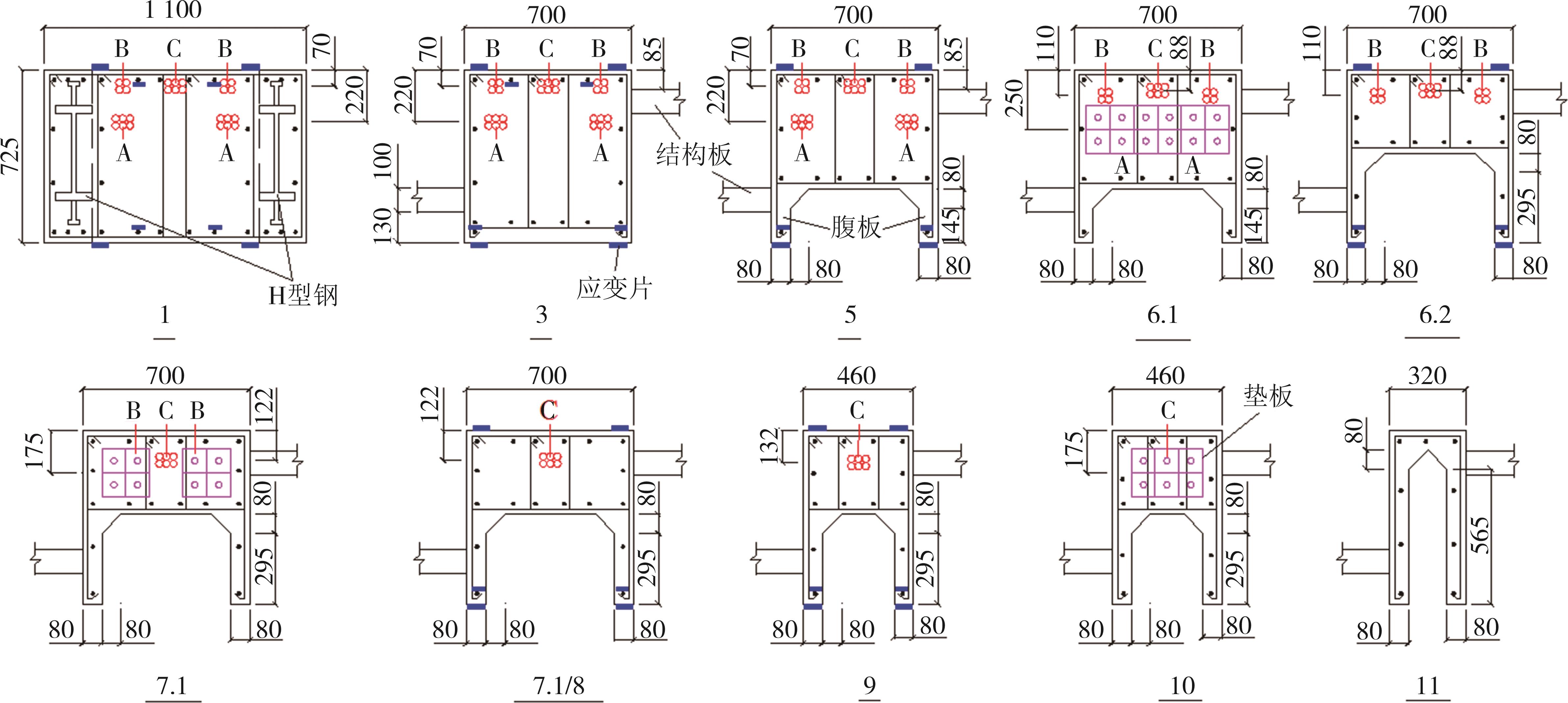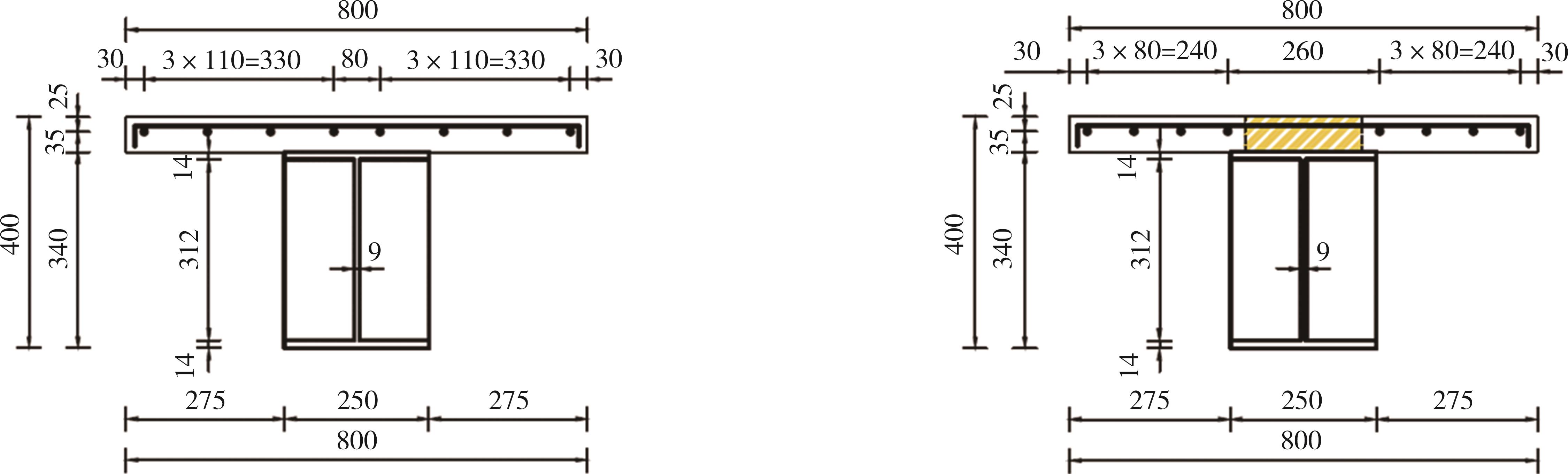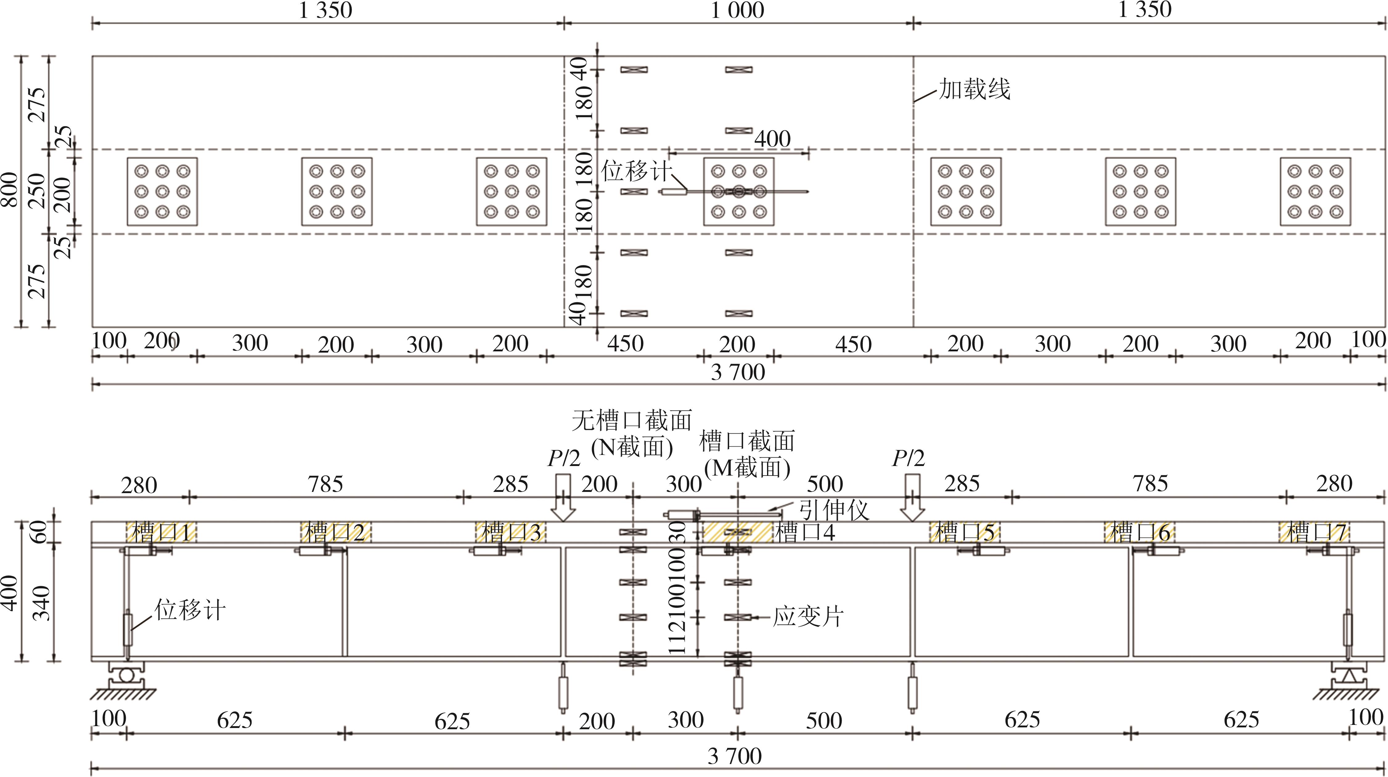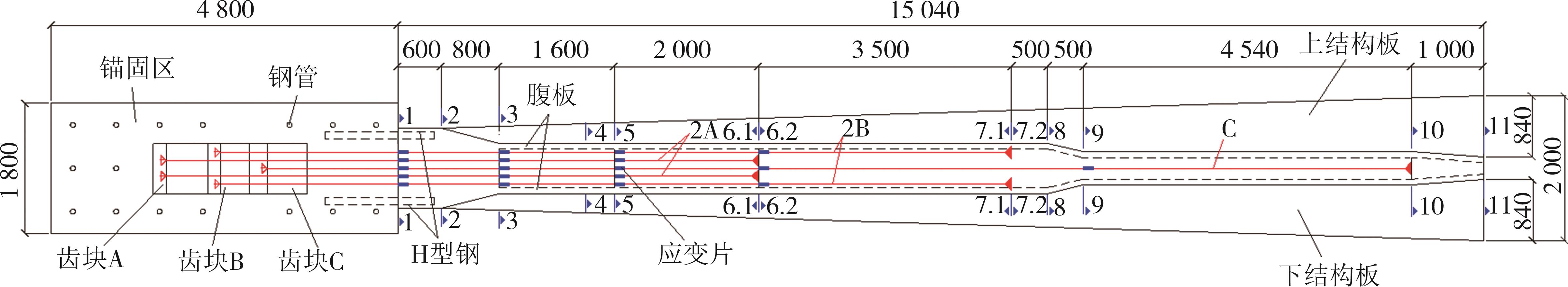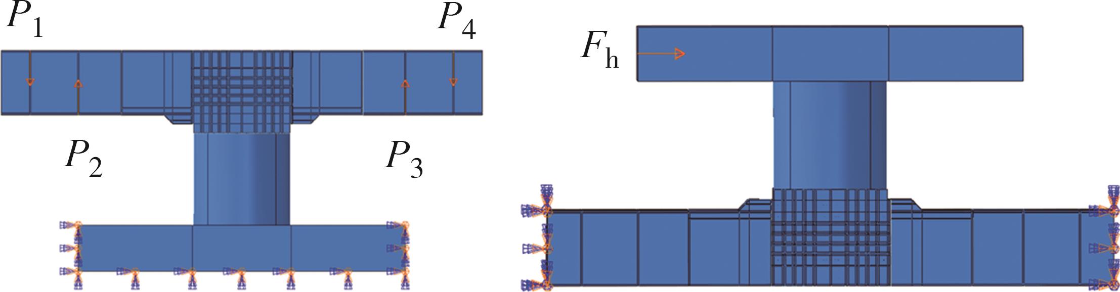 摘要:在箱形组合刚构桥墩梁节点位置的受压区箱梁底部设置承压板,可增大受压面积,避免箱梁底板应力集中和局部屈曲.承压板式墩梁节点传力机理与适用性尚不明确,缺乏相应的节点构造设计方法.鉴于此,本文通过验证后的实体有限元计算模型,开展承压板式箱形组合刚构桥试设计,研究承压板式墩梁节点的传力机理和荷载占比,建立墩梁节点内力计算方法,开展承压板构造参数和适用性分析.研究结果表明:在试设计构造尺寸和材料特性确定基础上,承压板式墩梁节点在轴压力和轴拉力作用时,主要通过箱梁腹板传力,占比分别约为60%和50%.弯矩传力机理与轴力类似,剪力作用下,剪力背向侧主要通过纵向加劲肋传力,占比约为-80%;剪力同向侧主要通过承压板传力,占比约为80%.理论计算结果与有限元计算结果偏差不大于8.8%,可用于承压板式墩梁节点内力计算.建议承压板构造设计中,相对横向间距取1/6、相对板厚取1.当墩高超过15 m,梁墩线刚度比大于0.047,承压板式墩梁节点的钢梁应力小于常规形式墩梁节点的钢梁应力;当墩高超过30 m后,采用承压板构造,可显著降低箱形组合刚构桥墩梁节点位置的钢梁应力.