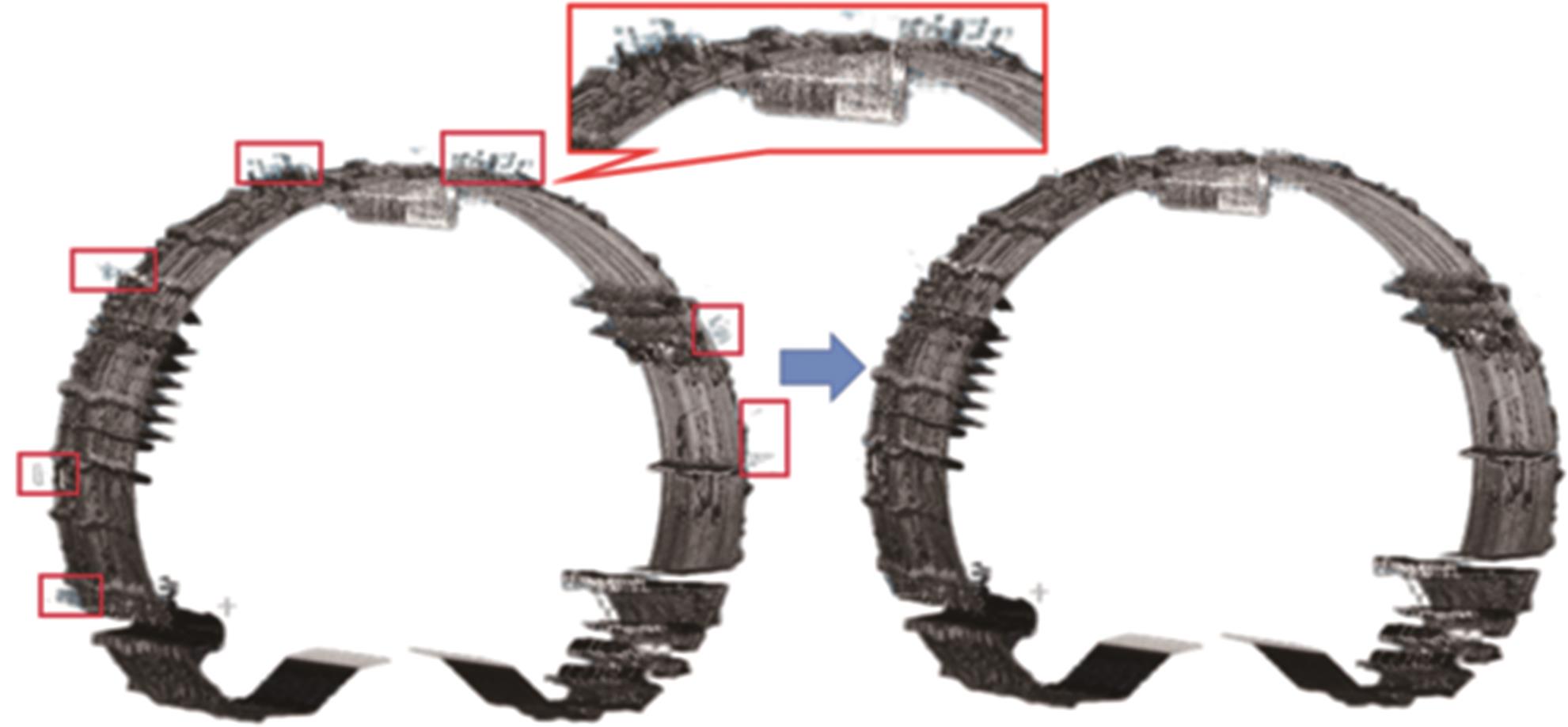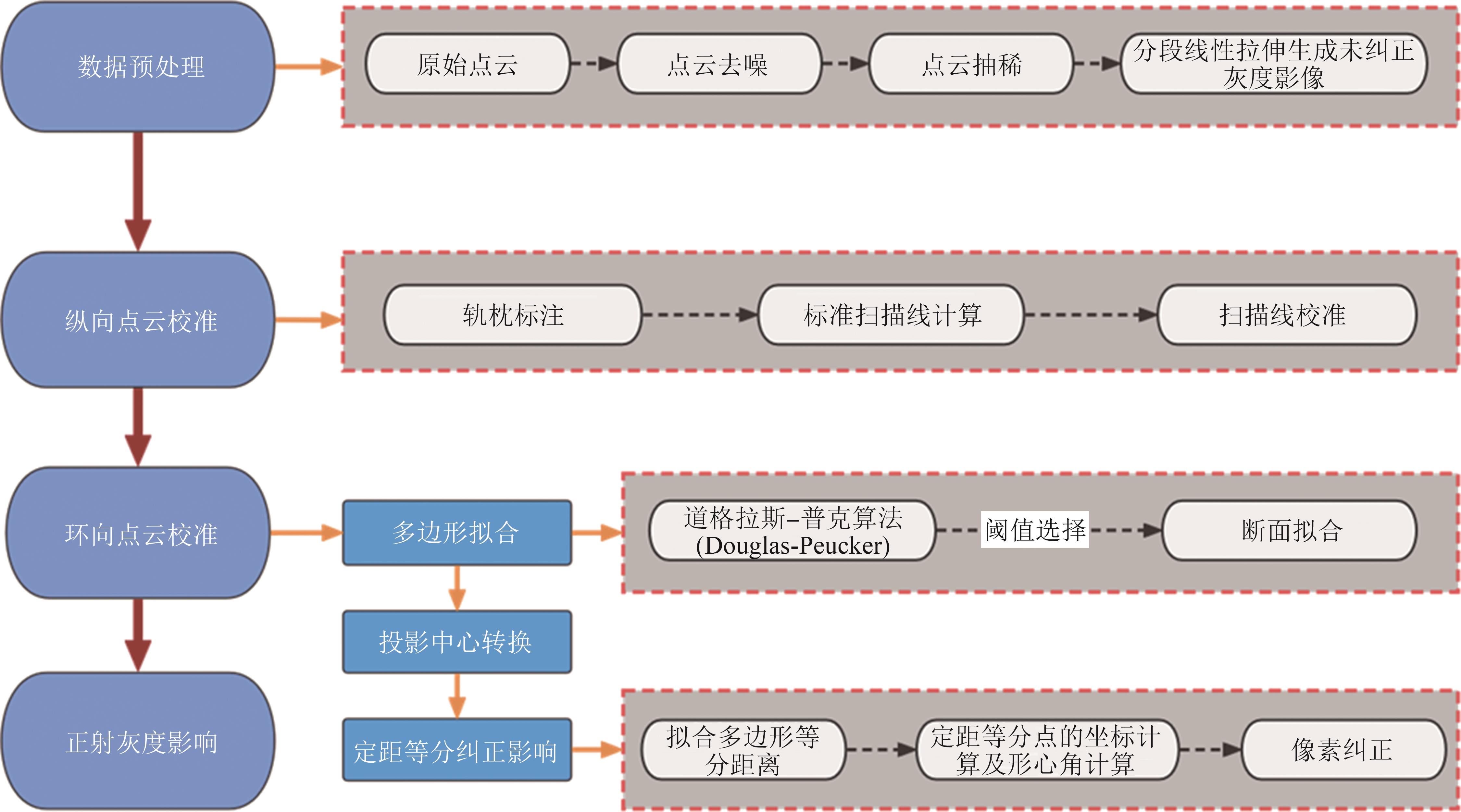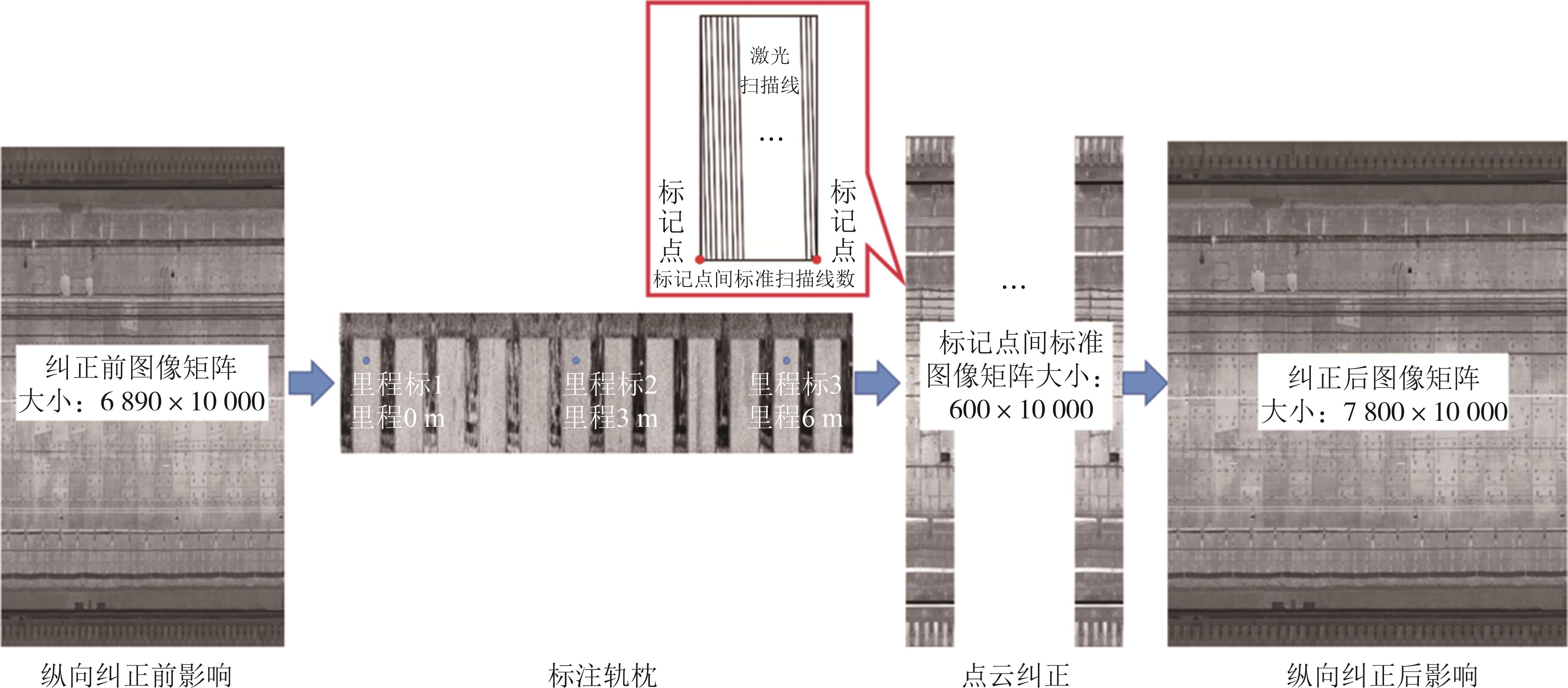 摘要:针对目前移动激光扫描获取的点云难以准确生成任意形状隧道的正射灰度影像难题开展系统研究.首先基于自主研发的TLSD(Tunnel Laser Scanning Detection)移动隧道检测系统获取隧道的点云数据,结合距离阈值法、图像增强算法、聚类算法及抽稀算法实现初始点云冗余及异常信息的有效处理;在此基础上,提出一种包含纵向和环向校准相结合的隧道正射影像生成方法,其中纵向校准方法以轨枕间距为量化基准,结合智能标注软件实现了隧道点云数据的纵向有效校准.在环向校准算法中,首先基于Douglas-Peucker隧道进行环向点云多边形拟合,随后进行投影中心转换,最后基于本文提出的定距等分法对隧道断面点云进行简化和校准,得到了与真实物理空间匹配的灰度图像,完成了任意形貌隧道正射影像的高效构建.测试结果表明,本文研发的方法可有效提高隧道关键几何信息量测及病害统计效率.其中隧道裂损、渗漏等病害量测精度达厘米级,可为隧道服役性能评判与处理提供准确的量化分析数据.