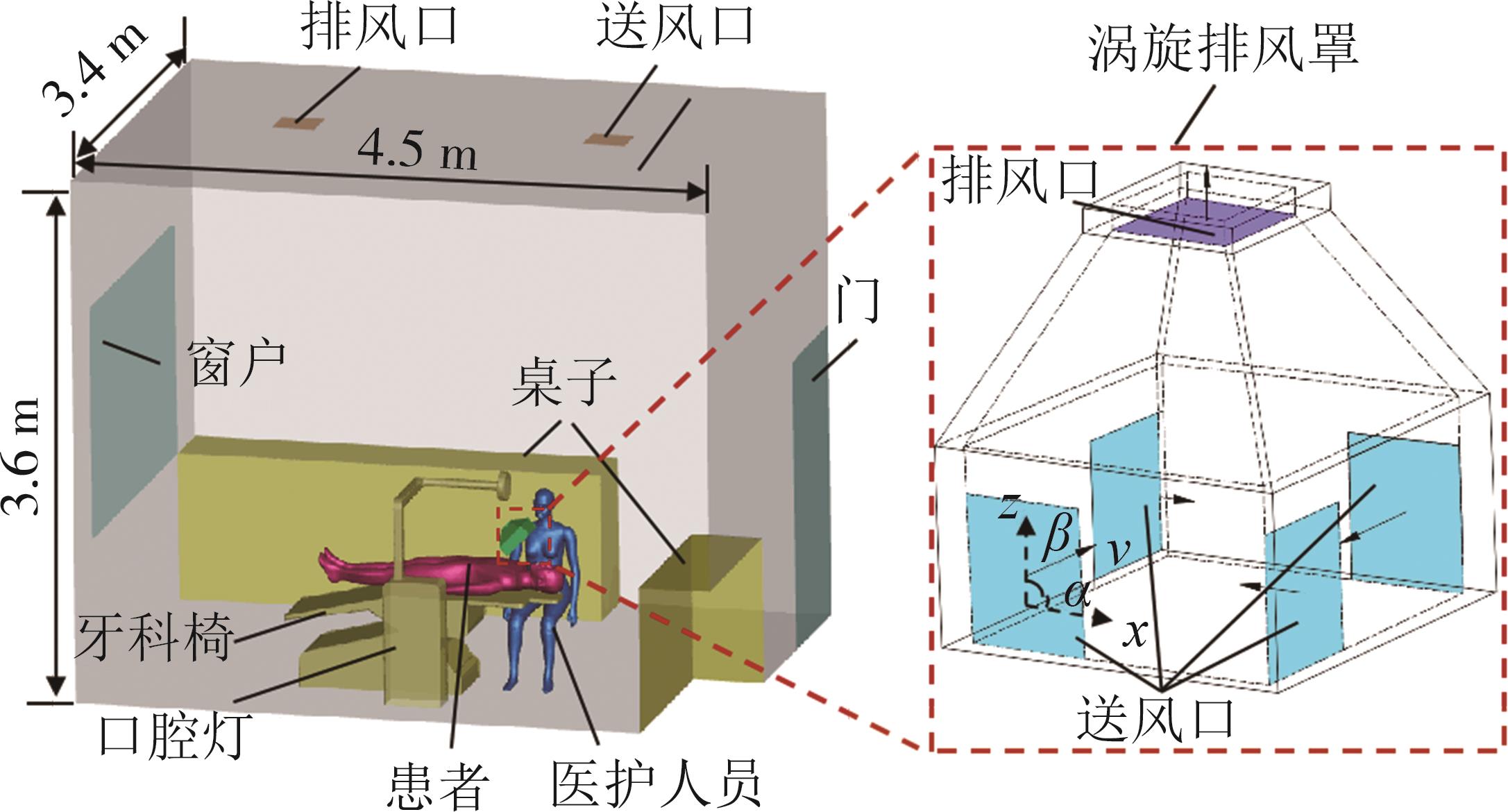 摘要:口腔诊疗过程伴随着大量喷溅颗粒物的产生,医护人员长时间暴露于高浓度颗粒物中可能会产生职业健康问题.为了对喷溅颗粒物实施高效去除进而降低医护人员暴露风险,本研究提出了一种具有长距离、高作用效益的新型涡旋排风罩.首先采用数值模拟方法,分析涡旋排风罩的流动及颗粒物去除特性,并与传统顶吸式排风罩进行对比;继而通过分析送排风速度比、水平和垂直送风角度对涡旋排风罩轴线速度、压力分布以及颗粒物去除效率的影响,探索涡旋排风罩最佳工作条件;然后在理想气流参数情况下,分析两种排风罩对不同喷溅速度的颗粒物的控制效果,探明涡旋排风罩的应用优势.结果表明,涡旋排风罩在送排风速度比为1、水平和垂直送风角度为0°时达到最佳工作条件,颗粒物去除效率可达65.9%,优于顶吸式排风罩47%的去除效率.本研究证实了涡旋排风罩在口腔诊疗中的应用潜力,为口腔诊疗过程局部源头控制提供了新方法,对诊疗微环境防控措施的构建具有参考价值.
