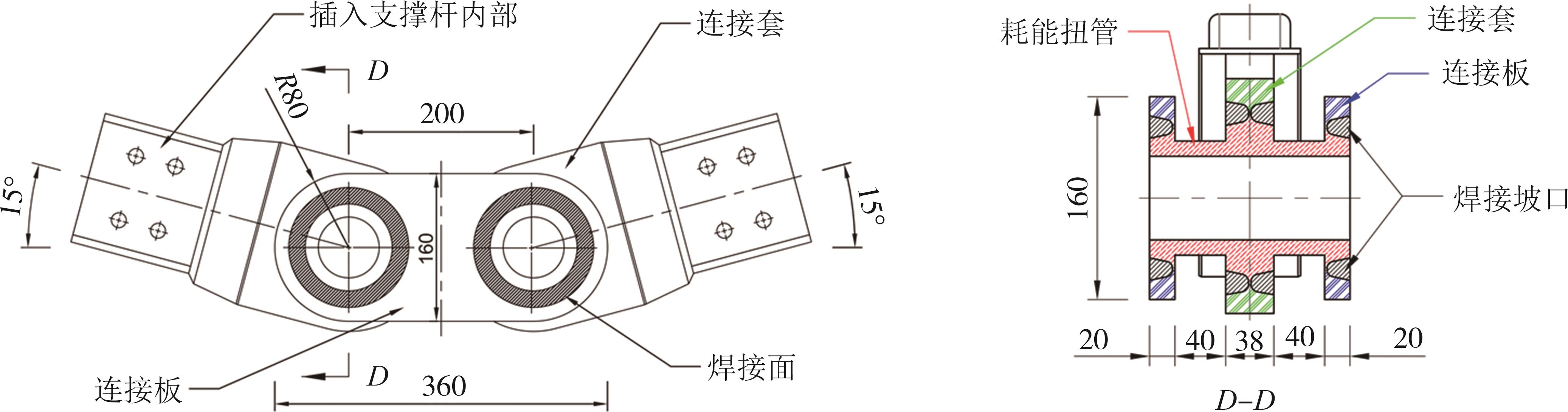 摘要:提出了一种基于钢管弹塑性扭转变形的承载-耗能双功能阻尼器,采用V字形折线型设计,使构件在外荷载作用下实现弹塑性扭转变形,从而同时提供承载和耗能能力. 通过理论分析推导了阻尼器的初始刚度、屈服荷载和屈服位移等基本力学参数,并设计了一种双扭管三折线V字形构件,用于框架结构的斜撑,简称为双扭管V型斜撑. 在拟静力低周往复加载条件下,试验和仿真结果表明,阻尼器滞回曲线饱满,耗能能力较强,设计位移(50 mm)下的等效黏滞系数达到0.38,达到了屈曲约束支撑(buckling-restrained brace,BRB)的同类指标. 试件的刚度退化规律和耗能特性与BRB类似,验证了其作为耗能支撑双功能阻尼器的可行性. 仿真结果与试验高度一致,验证了理论模型的准确性.通过优化支撑杆初始角度至25°,构件的拉压不平衡系数降低至1.2,满足相关规范要求,进一步验证了该设计的工程可行性. 最后,对构件自身的几何非线性导致的拉压不平衡系数过大的问题进行了详细讨论分析,为后续设计方案改进提供了理论依据.