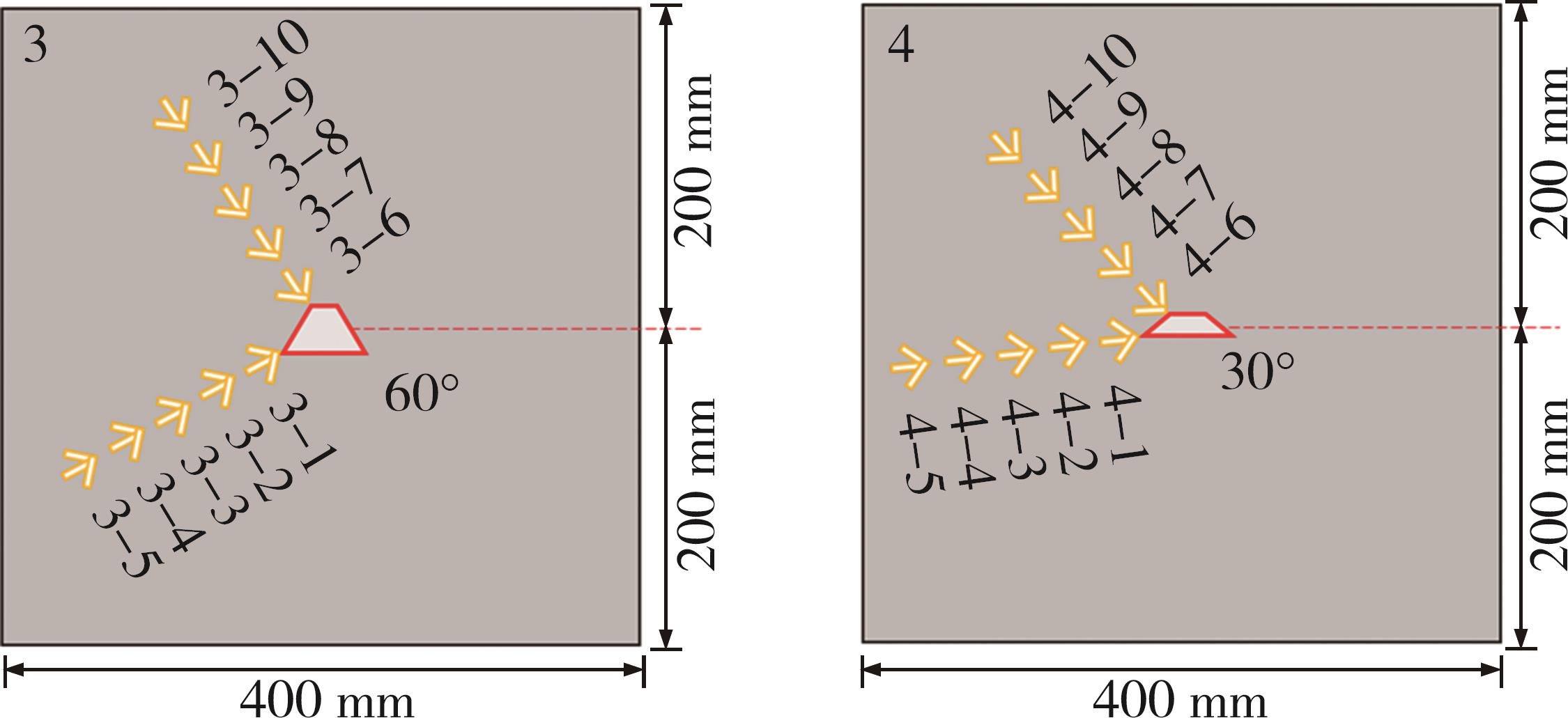 摘要:针对静力裂岩中圆形钻孔裂纹发育随机且致裂效果欠佳的局限性,提出采用具有应力集中及定向致裂潜力的四边形孔作为钻孔,研究其静力裂岩机理并依据尖角应力及能量利用率定量分析试样断裂效果,并运用数字图像相关技术监测其动态断裂过程. 在此基础上,使用PFC2D研究钻孔尖角角度及双孔间距对致裂效果的影响. 结果表明:四边形孔的裂纹扩展方向是可控的,且沿着其锐角尖角角平分线延长线方向发生断裂,根据试样表面裂纹扩展过程中的位移云图,其断裂过程可分为三个阶段:初始阶段、发育扩展阶段、贯通阶段. 钻孔应力集中效应与其形状及尖角角度有关,应力增长速率在梯形孔的尖角为30°时获得最大值,应力集中效应最好. 钻孔形状对能量利用率的影响较小,梯形孔能量利用率较菱形孔稍高,但相差在5%以内;而尖角角度的变化对能量利用率影响较大,当尖角从60°减小为30°时,菱形孔能量利用率提升19.63个百分点,梯形孔提升17.63个百分点. 单孔模拟试验中,菱形、梯形孔在尖角为60°时裂纹宽度最大,总体断裂效果最好;双孔联合致裂模拟试验中,双菱形、梯形孔间距为试样长度1/3时,断裂效果最佳.