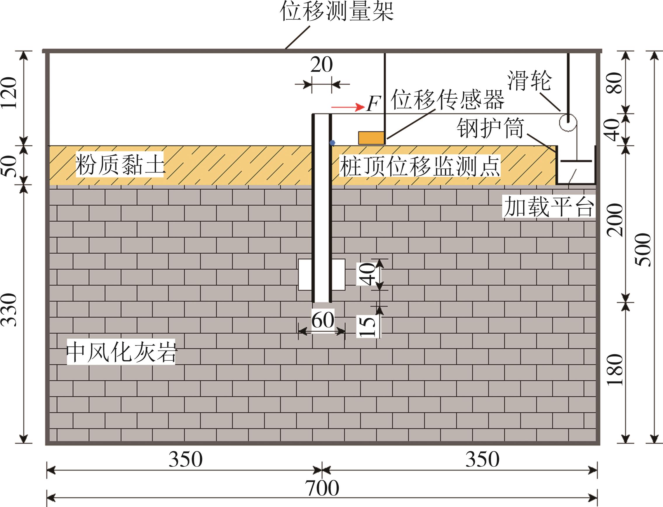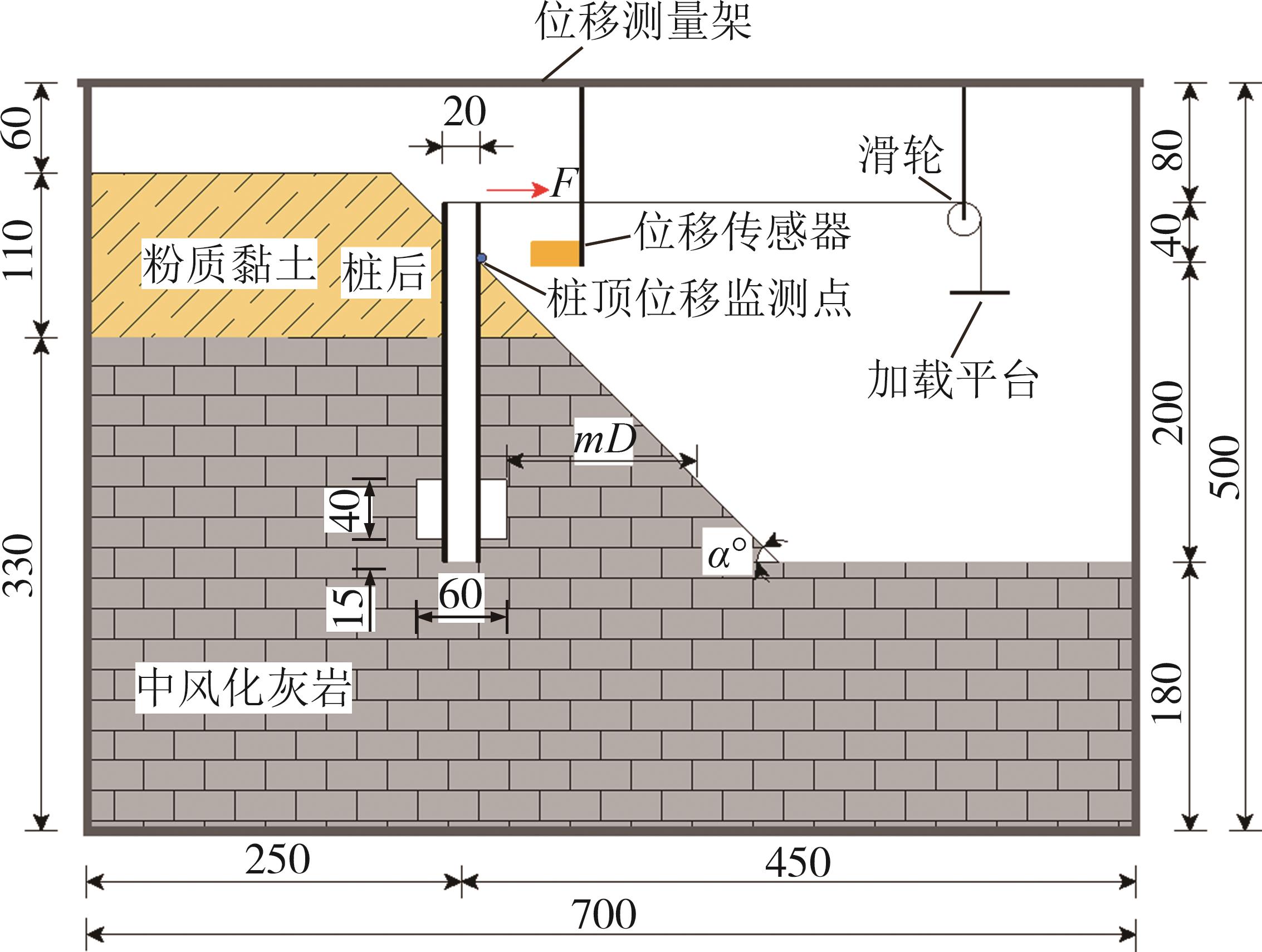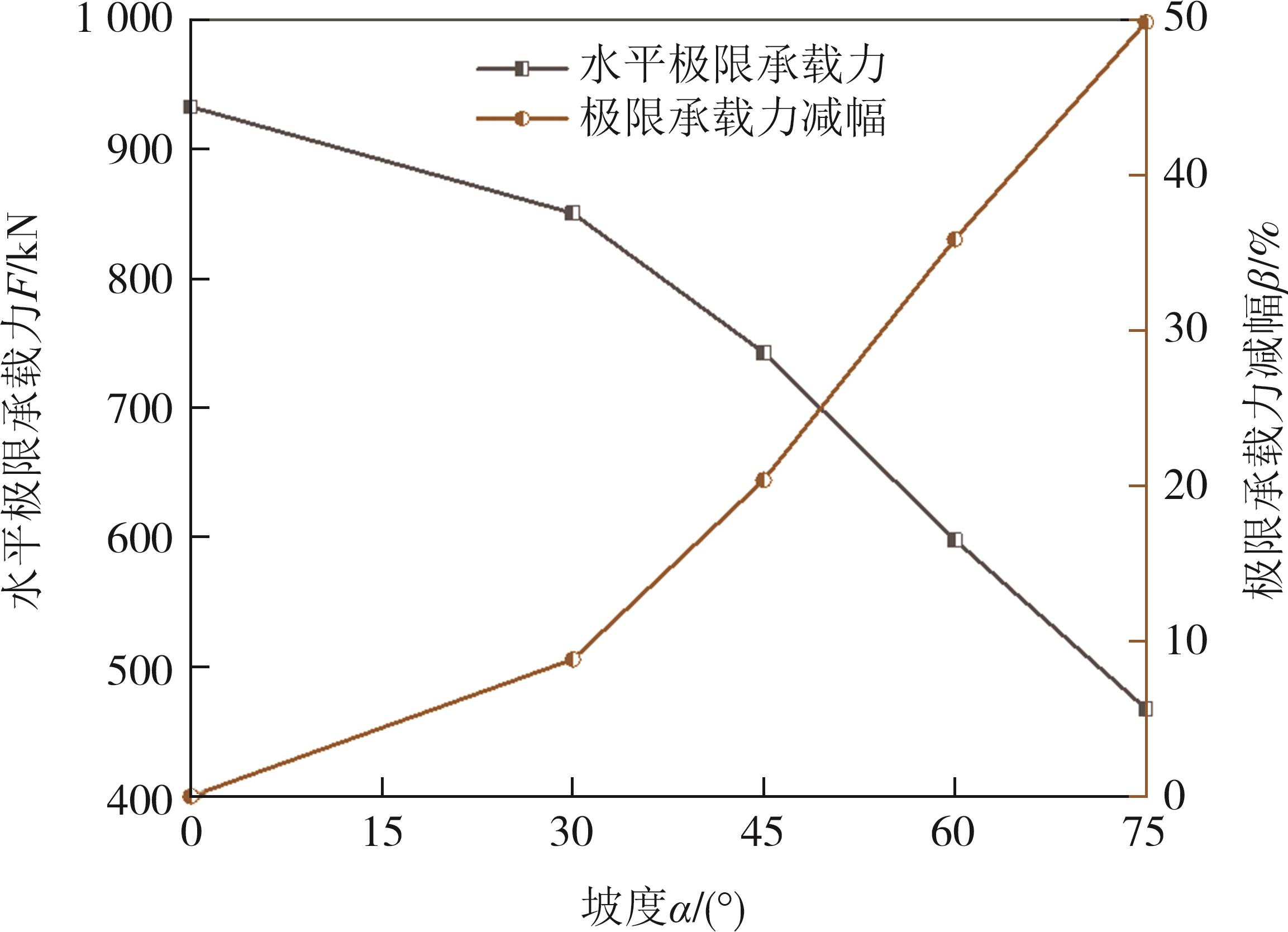 摘要:为研究陡坡岩溶发育区桥梁桩基水平承载特性,以高速公路工程为依托,采用离心模型试验,研究了桩基础穿越溶洞且处于陡坡地段时,在水平荷载作用下地基坡度变化对桩基础极限承载力、桩身弯矩以及桩侧土抗力的影响. 结果表明,桩基础的水平极限承载力随地基坡度增大而减小. 坡度小于30°时,桩基础的水平极限承载力减幅小于10%;坡度大于30°后,桩基础的水平极限承载力和桩顶水平位移受到显著影响. 桩身弯矩沿埋深方向先逐渐增大后逐渐减小至零,嵌岩层内衰减速度最大,弯矩最大值出现在距桩顶2.5~5倍桩径范围内. 随坡度增大,桩身弯矩最大值逐渐增大,最大弯矩的位置逐渐下移. 桩侧土抗力沿桩基埋深先增大后减小至零,土抗力最大值出现在距桩顶2.5~5倍桩径范围内. 随荷载增大,桩侧土抗力最大值的深度逐渐下移. 不同地基坡度下桩侧土抗力均表现出桩前小、桩后大的规律,土抗力差异集中在距桩顶2.5~5倍桩径范围内.