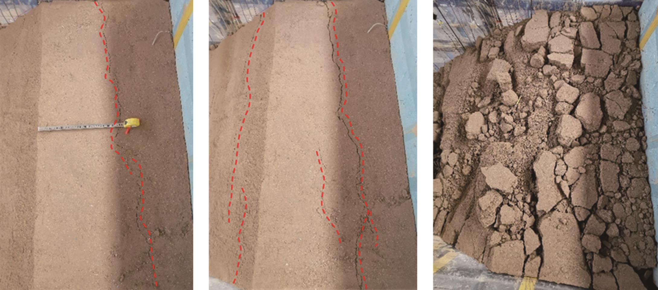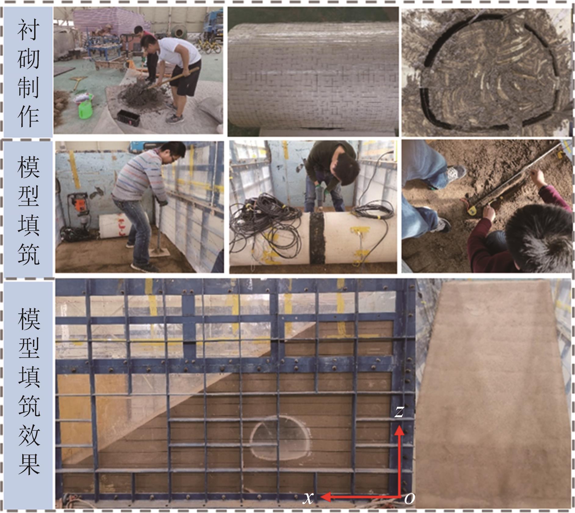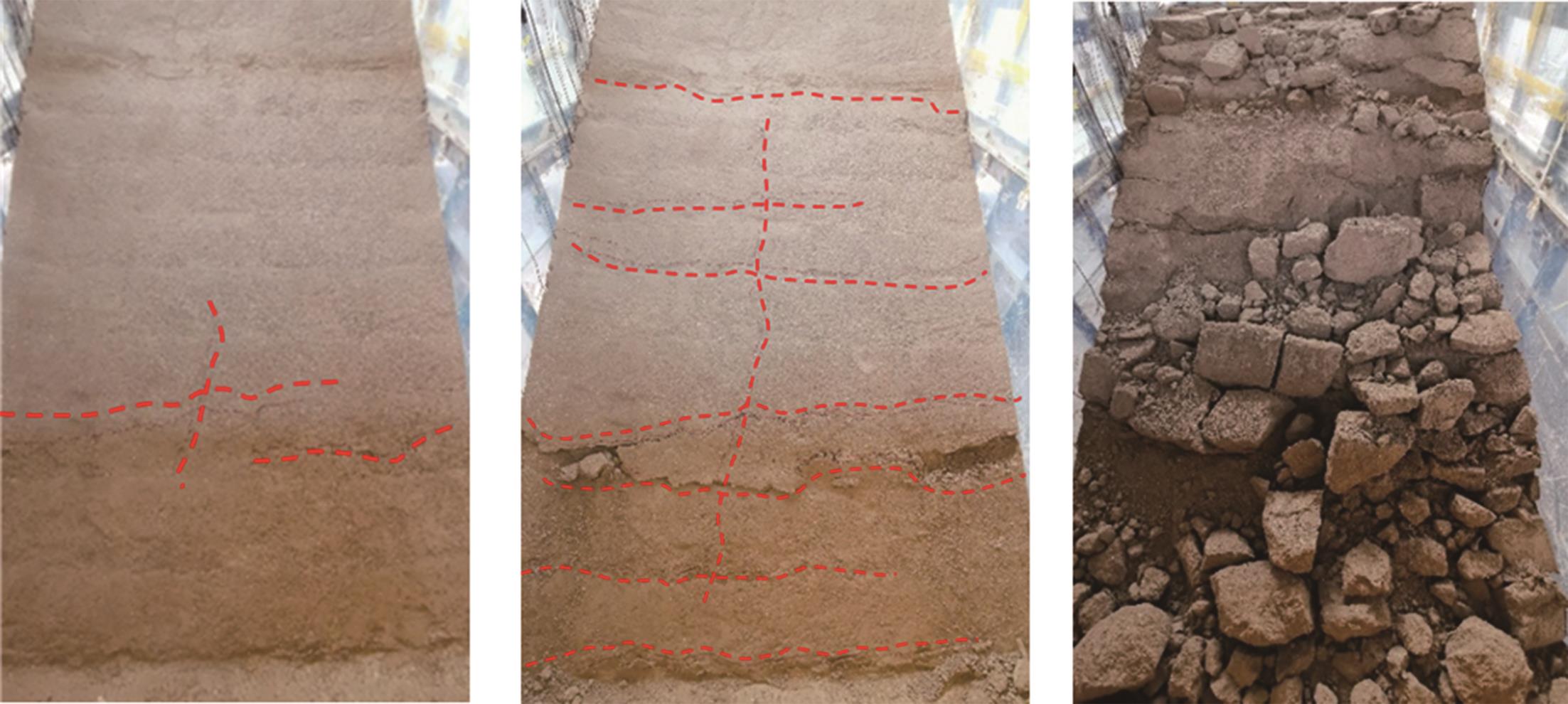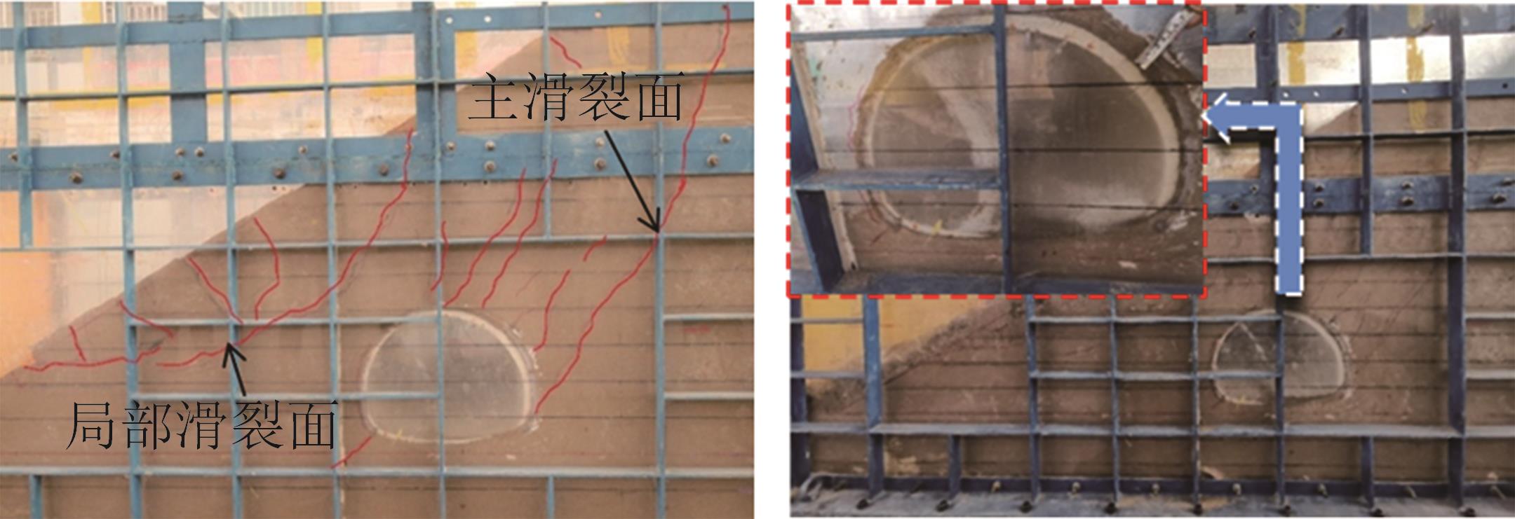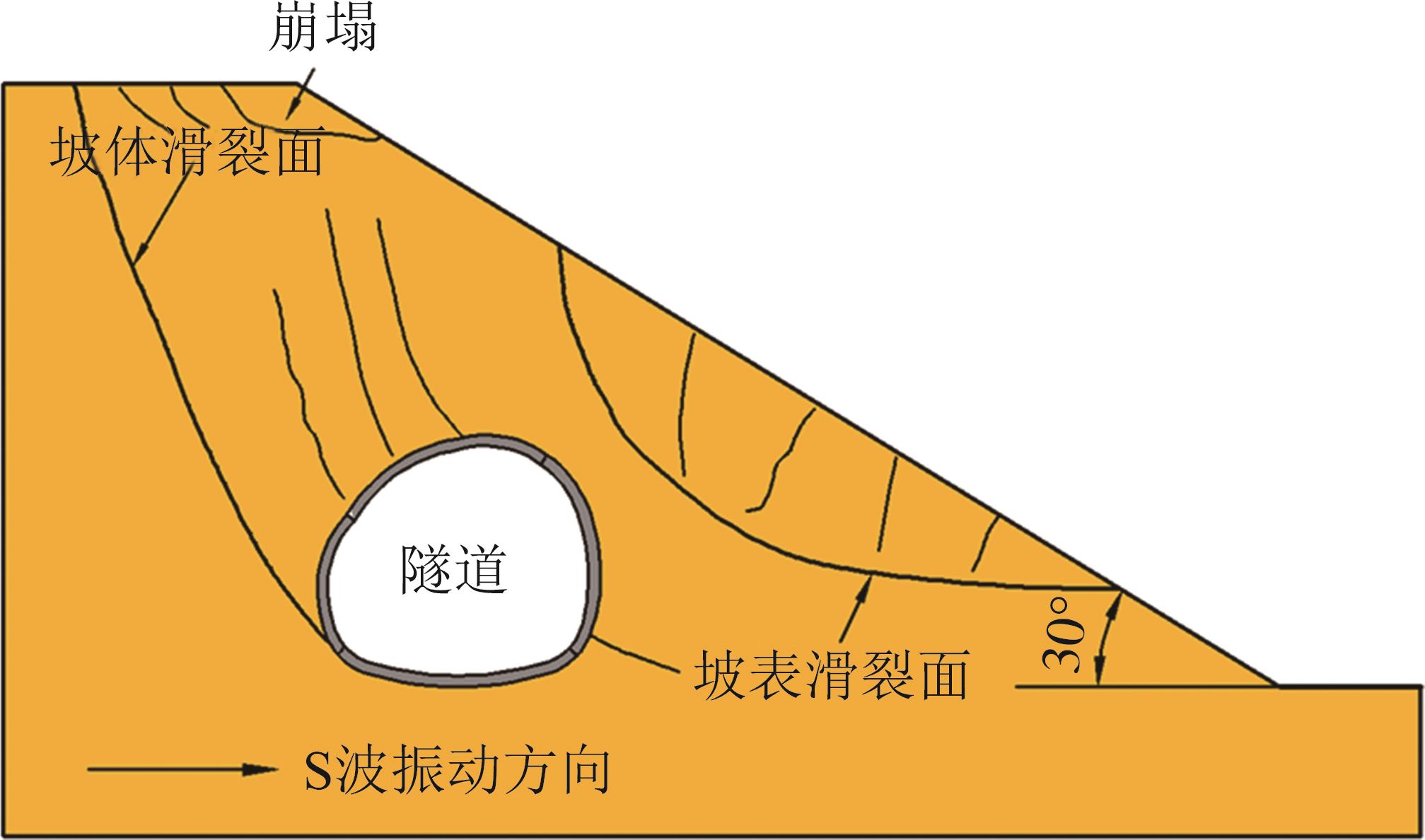 摘要:黄土高原地区强震频发,常发生大规模密集型黄土滑坡. 浅埋偏压黄土隧道因覆盖层厚度小、坡面临空面等因素的影响,地震动放大效应明显,易发生严重震害. 本文基于大型振动台模型试验,对浅埋偏压大断面黄土隧道的震害特征和震害机制进行了系统研究. 结果表明,隧道空腔的存在对坡面加速度放大系数的分布特征影响较大,影响区域主要集中在0.25H~0.80H范围内;坡体内水平向加速度放大系数随高程的增大呈非线性增长趋势,约2/3坡高以下区域加速度放大效应较弱,约2/3坡高以上区域加速度放大效应显著增强;在水平向地震动作用下,偏压隧道衬砌沿右拱腰至左墙脚以及左拱腰至右墙脚共轭45°方向形成贯通拉压裂缝,震害严重;小角度偏压条件下,坡体内部产生了从坡顶贯通至隧道深埋侧墙脚处的连续滑裂面,坡体表面和坡顶产生了局部连续滑移和局部坍塌;隧道空腔的动力放大作用是坡表局部滑裂面形成的主要原因,而地震惯性力与岩土体重力产生的斜向合力是隧道衬砌深埋侧挤入变形、浅埋侧挤出变形的根本原因. 本研究可为浅埋偏压黄土隧道的抗震设计提供参考.