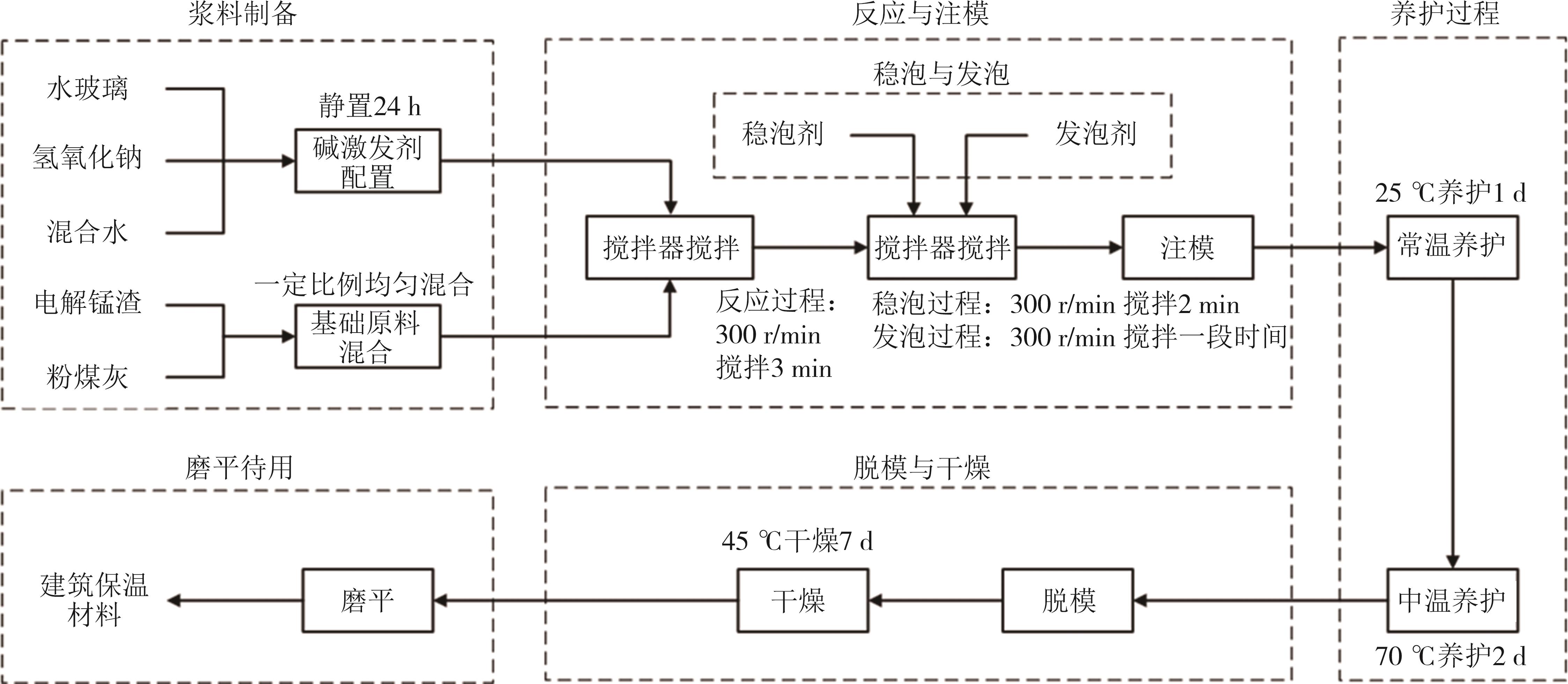摘要:针对当前电解锰渣固废的资源化利用不足、工艺复杂、经济附加值较低等问题,为有效消纳和利用电解锰渣,在前期理论分析基础上采用实验的方法,研究了基础原料配比(电解锰渣的质量与电解锰渣及粉煤灰的质量和之比)、碱激发剂配比(水玻璃、氢氧化钠和混合水的用量配比)、发泡剂和稳泡剂的种类与用量等因素对目标保温材料性能的影响. 结果表明:基础原料配比和碱激发剂配比均会对SiO2/Al2O3摩尔比、SiO2/Na2O摩尔比和水灰比产生影响,进而影响试样的力学性能;基础原料配比为0.7、SiO2/Al2O3摩尔比为4.0、SiO2/Na2O摩尔比为2.5、水灰比为0.5时建筑结构材料试样的力学性能最优,其抗压强度为11.15 MPa,密度为 1 476 kg/m3;发泡剂和稳泡剂的种类与用量会对试样的各项性能产生影响,当发泡剂为双氧水,用量为4~6 g,稳泡剂为实验室自制稳泡剂,用量为2 g时,建筑保温材料试样的各项性能最优,其导热系数为0.104~0.131 W/(m·K),抗压强度为0.69~1.49 MPa,密度为433~533 kg/m3,成本为1 294~1 722 元/m3. 该研究为较大量消纳和利用电解锰渣提供了新思路,在满足保温隔热性能的同时降低建筑能源需求,经进一步优化后具有一定的工程应用价值.